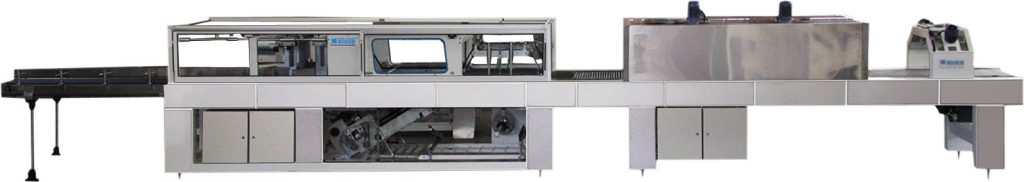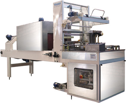 Máquina enfardadeira monobloco automática, com capacidade para 1000 pacotes/hora, destinadas às indústrias de bebidas, alimentos e farmacêuticos.