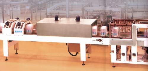 Túnel de encolhimento com estrutura em aço carbono, pintura epóxi e acabamento em chapa de alumínio.